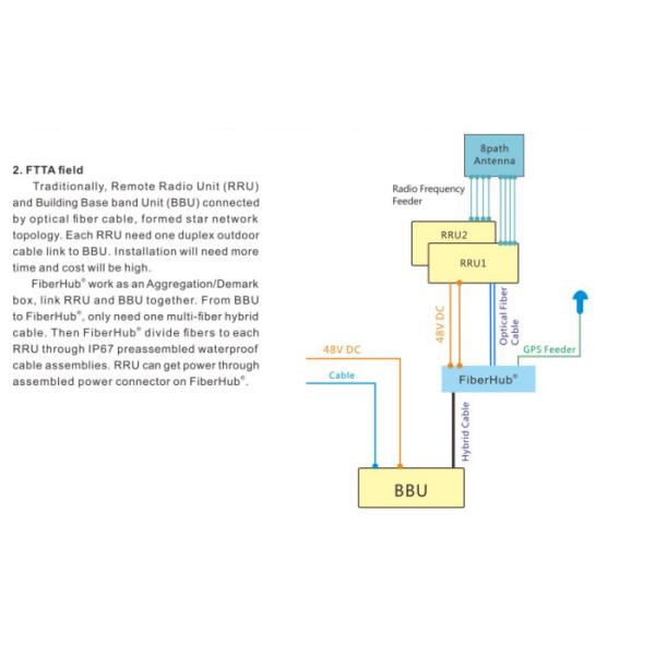 Fiberhub work as an aggregation/Demark box, link RRU and BBU togehter, From BBU to fiberhub, only need one multi-fiber hybrid cable. then fiberhub divide fibers to each cable. Then fiberhub divied fibers to each RRU through IP67 presassembled waterproof cable assemblies. RRU can get power through assembled power connector on fiberhub.